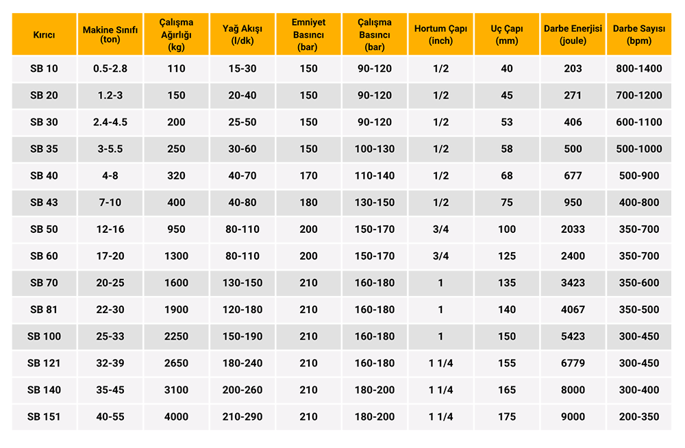 SB - Serisi Kırıcılar Hidrolik Kırıcılar için Öne Çıkan Özellikler: Geliştirilmiş titreşim sönümleme sistemiSağlam yapıya sahip ince profilTamamen kapalı sağlam gövdeYüksek güç/ağırlık oranıDüşük çalışma maliyeti Hammer Attachment SB10 İş Makinesi Ağırlığı: 0.5-2.8 tonKırıcı Çalışma Ağırlığı: 110 kgÇalışma Basıncı: 90-120 bar Hammer Attachment SB20 İş Makinesi Ağırlığı: 1.2-3.0 tonKırıcı Çalışma Ağırlığı: 150 kgÇalışma Basıncı: 90-120 bar Hammer Attachment SB30 İş Makinesi Ağırlığı: 2.4-4.5 tonKırıcı Çalışma Ağırlığı: 200 kgÇalışma Basıncı: 90-120 bar Hammer Attachment SB35 İş Makinesi Ağırlığı: 3.0-5.5 tonKırıcı Çalışma Ağırlığı: 250 kgÇalışma Basıncı: 100-130 bar Hammer Attachment SB40 İş Makinesi Ağırlığı: 4-8 tonKırıcı Çalışma Ağırlığı: 320 kgÇalışma Basıncı: 110-140 bar Hammer Attachment SB43 İş Makinesi Ağırlığı: 7-10 tonKırıcı Çalışma Ağırlığı: 400 kgÇalışma Basıncı: 130-150 bar Hammer Attachment SB50 İş Makinesi Ağırlığı: 12-16 tonKırıcı Çalışma Ağırlığı: 950 kgÇalışma Basıncı: 150-170 bar Hammer Attachment SB60 İş Makinesi Ağırlığı: 17-20 tonKırıcı Çalışma Ağırlığı: 1300 kgÇalışma Basıncı: 150-170 bar Hammer Attachment SB70 İş Makinesi Ağırlığı: 20-25 tonKırıcı Çalışma Ağırlığı: 1600 kgÇalışma Basıncı: 160-180 bar Hammer Attachment SB81 İş Makinesi Ağırlığı: 22-30 tonKırıcı Çalışma Ağırlığı: 1900 kgÇalışma Basıncı: 160-180 bar Hammer Attachment SB100 İş Makinesi Ağırlığı: 25-33 tonKırıcı Çalışma Ağırlığı: 2279 kgÇalışma Basıncı: 160-180 bar Hammer Attachment SB121 İş Makinesi Ağırlığı: 32-39 tonKırıcı Çalışma Ağırlığı: 2800 kgÇalışma Basıncı: 160-180 bar Hammer Attachment SB140 İş Makinesi Ağırlığı: 35-45 tonKırıcı Çalışma Ağırlığı: 3100 kgÇalışma Basıncı: 180-200 bar Hammer Attachment SB151 İş Makinesi Ağırlığı: 40-55 tonKırıcı Çalışma Ağırlığı: 4000 kgÇalışma Basıncı: 180-200 bar HAMMER ATTACHMENT Kırsan Hidrolik Kırıcı Güç, dayanıklılık ve güvenlik